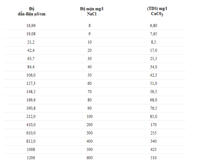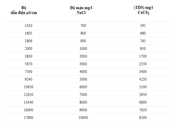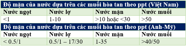 Tính chất nước nhiễm mặn ở mỗi khu vực, mỗi vị trí địa lý ít nhiều sẽ có sự khác nhau. Bảng dưới đây minh họa độ mặn của nước dựa trên các muối hòa tan theo ppt:
